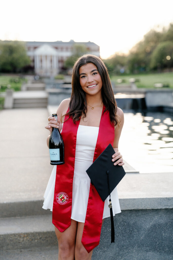 We lined up for photos at the iconic fountain, where the girls popped some champagne and celebrated their achievements with joyous cheers. Their friendship was heartwarming, and after a celebratory splash in the fountain, we headed over to RJ Bentley’s, a beloved local bar with a rich history as a staple hangout spot for UMD students. We took photos at the back bar at the end of the night and it was so much fun! Once the girls changed into their 2nd outfit, the classic jeans and college tee, we captured some of their final casual college memories at their go-to bar.